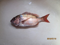 | 2018年7月10日、マダイ、尾叉長22cm 今沢海岸、カゴ釣り